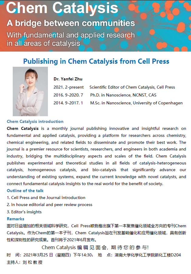 主讲人:Dr. Yanfei Zhu Scientific Editor of Chem Catalysis, Cell Press