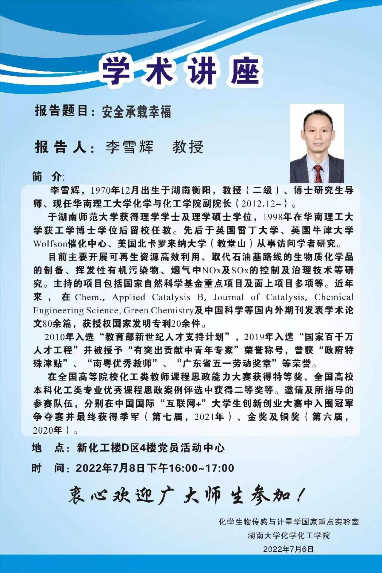 学术地点 新化工楼D区4楼党员活动中心 主讲人 李雪辉教授