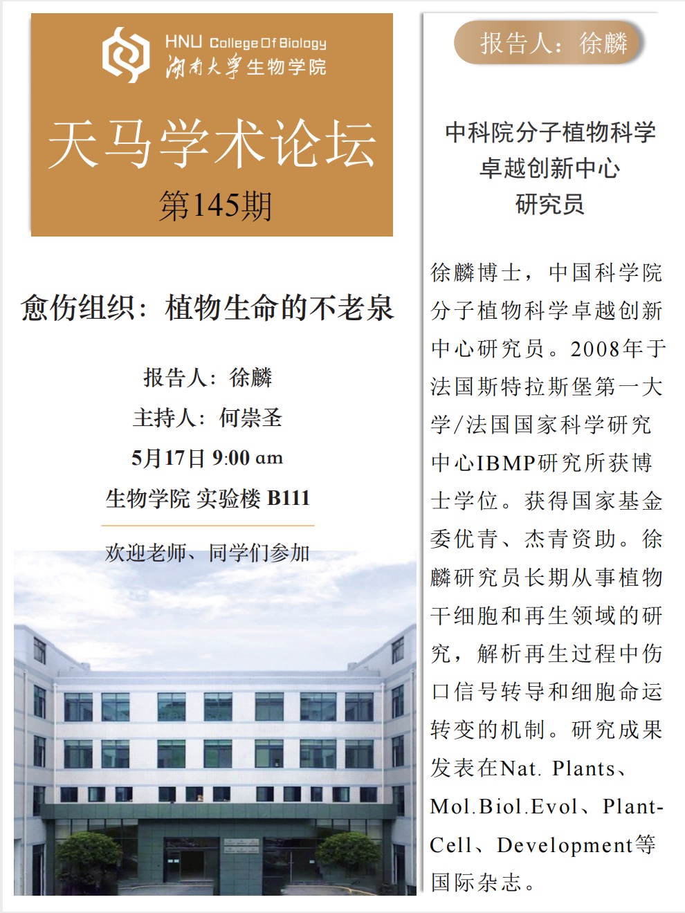 学术地点 生物学院实验楼B111 主讲人 徐麟