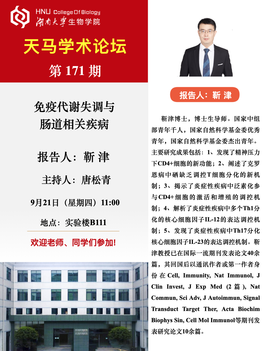 学术地点 生物学院实验楼B111 主讲人 靳津