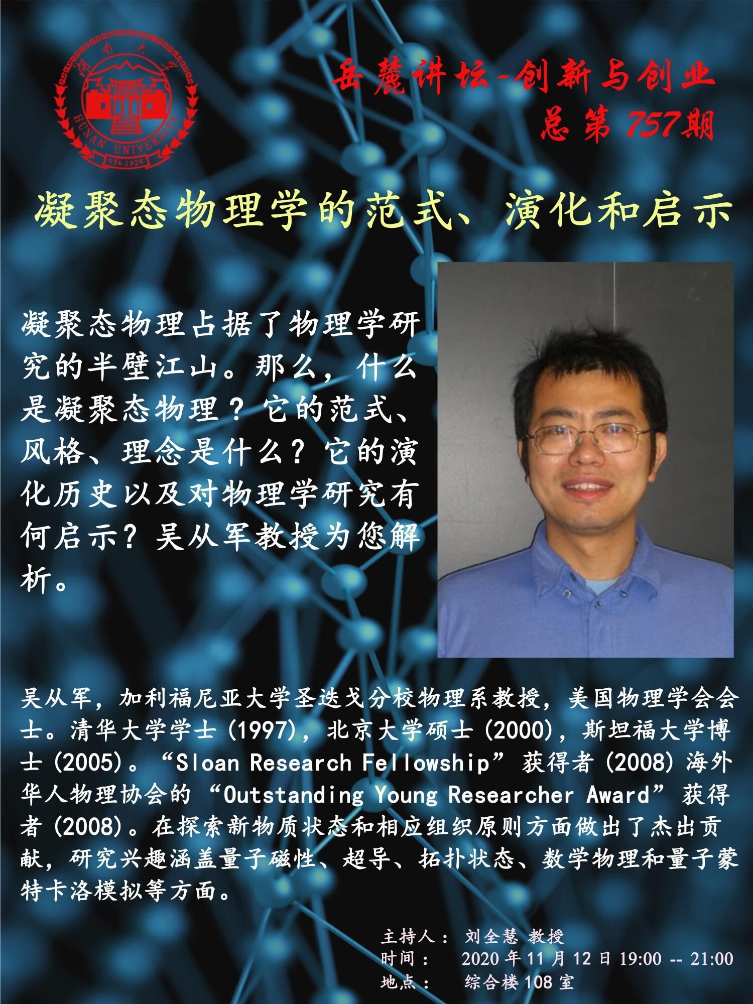 吴从军,加利福尼亚大学圣迭戈分校物理系教授,美国物理学会会士。清华大学学士(1997),北京大学硕士(2000),斯坦福大学博士(2005)。“Sloan Research Fellowship”获得者(2008)海外华人物理协会的“Outstanding Young Researcher Award”获得者(2008)。在探索新物质状态和相应组织原则方面做出了杰出贡献,研究兴趣涵盖量子磁性、超导、拓扑状态、数学物理和量子蒙特卡洛模拟等方面。