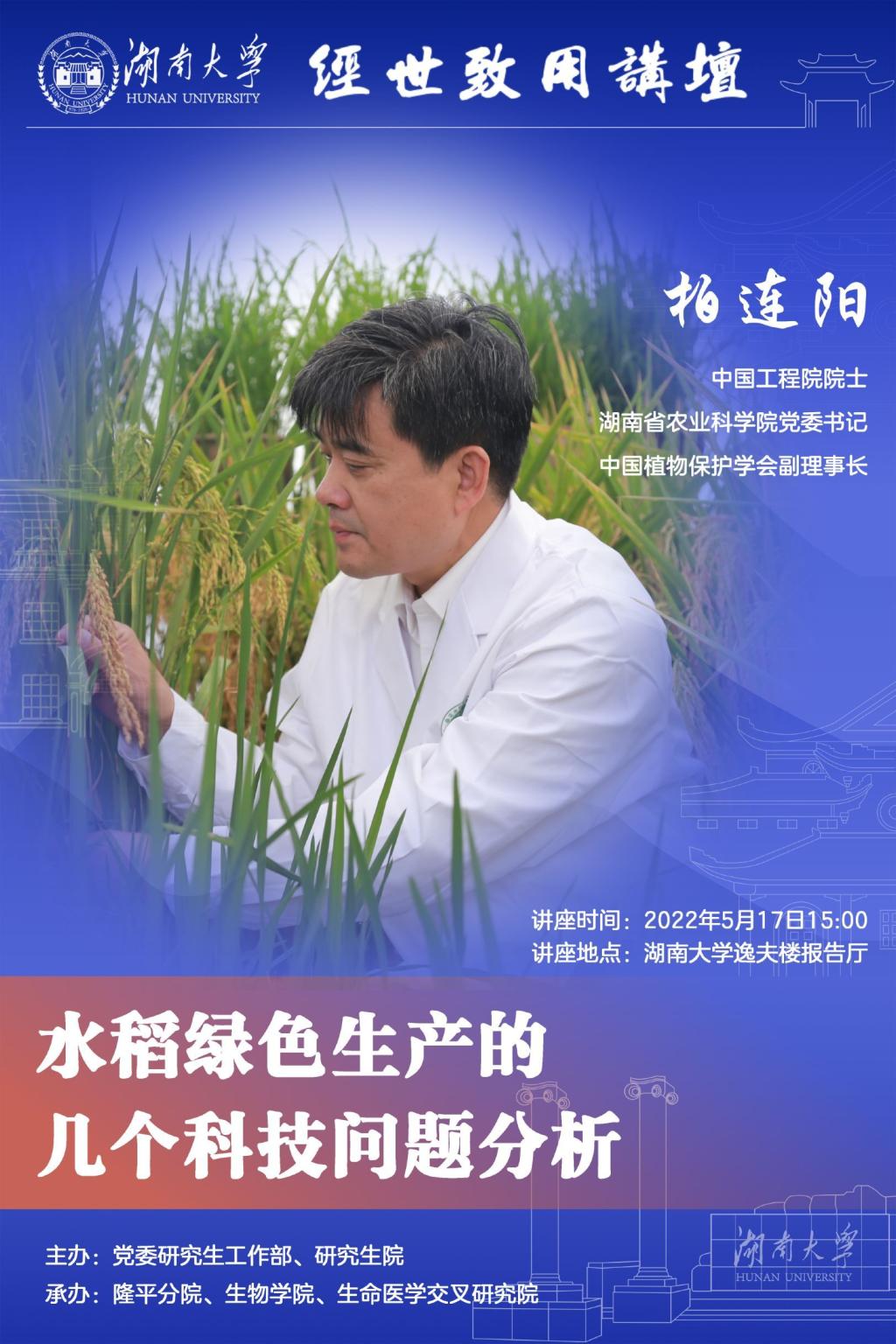 5月17日15:00邀请中国工程院院士、湖南省农科院党委书记柏连阳老师莅临湖南大学逸夫楼报告厅作“水稻绿色生产的几个科技问题分析”主题报告,欢迎同学们前来聆听。