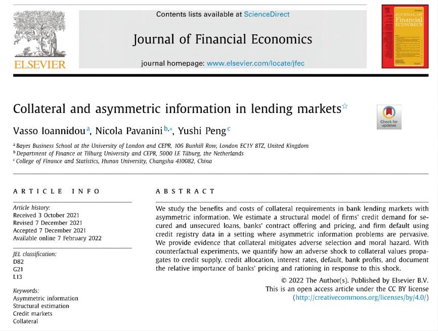 2022/04/28彭雨诗在研究抵押品在信息不对称的银行信贷市场中的作用取得进展近日,金融与统计学院助理教授彭雨诗在国际顶级金融学期刊《Journal of Financial Economics》刊发合作论文“Collateral and Asymmetric Information in Lending Markets”,研究了抵押品在信息不对称的银行信贷... -