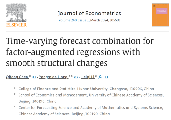 2024/02/26金统院李海奇教授团队研究成果在计量经济学顶刊发表近日,金融与统计学院李海奇教授及博士生陈麒同在计量经济学领域取得研究进展,研究成果以“Time-varying forecast combination for factor-augmented regressions with smooth structural changes”为题在计量经... -