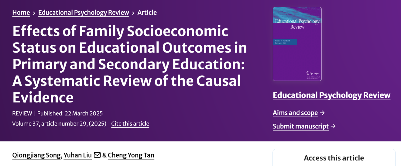 2025/04/08教科院宋琼将老师研究成果在《Educational Psychology Review》发表近日,教科院宋琼将老师与香港大学教育学院研究团队在教育平等政策研究领域取得进展。研究成果以《Effects of Family Socioeconomic Status on Educational Outcomes in Primary and Secondary Education: A Syst... -