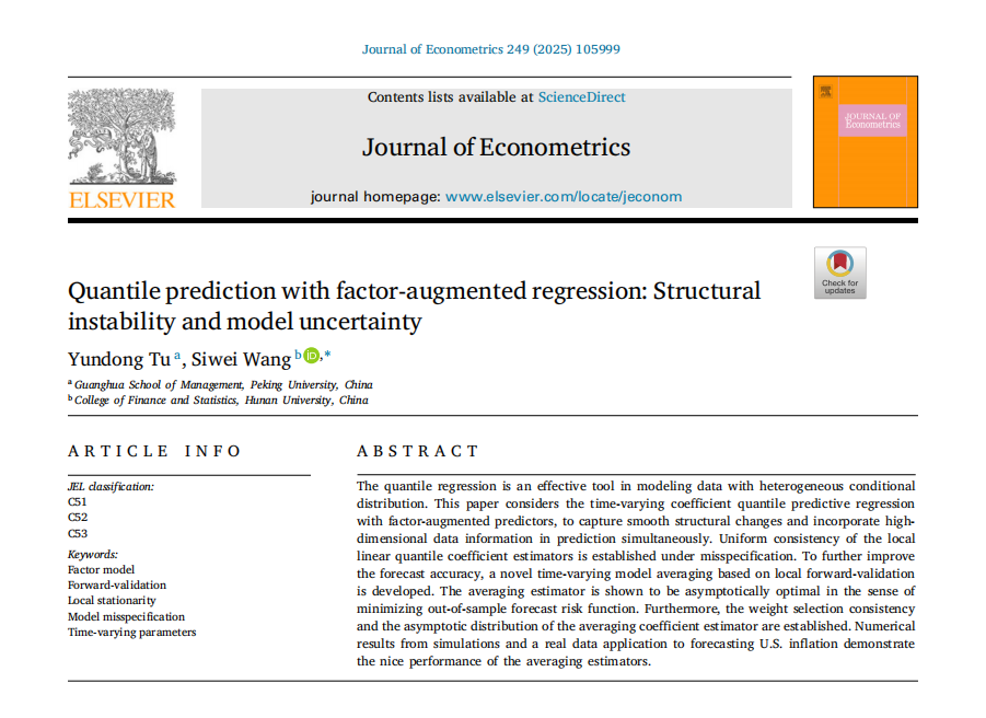2025/04/10金统院汪思韦助理教授研究成果在计量经济学顶刊发表近日,金融与统计学院汪思韦助理教授在计量经济学领域取得研究进展,研究成果以“Quantile prediction with factor-augmented regression: Structural instability and model uncertainty”为题在计量经济学国际... -