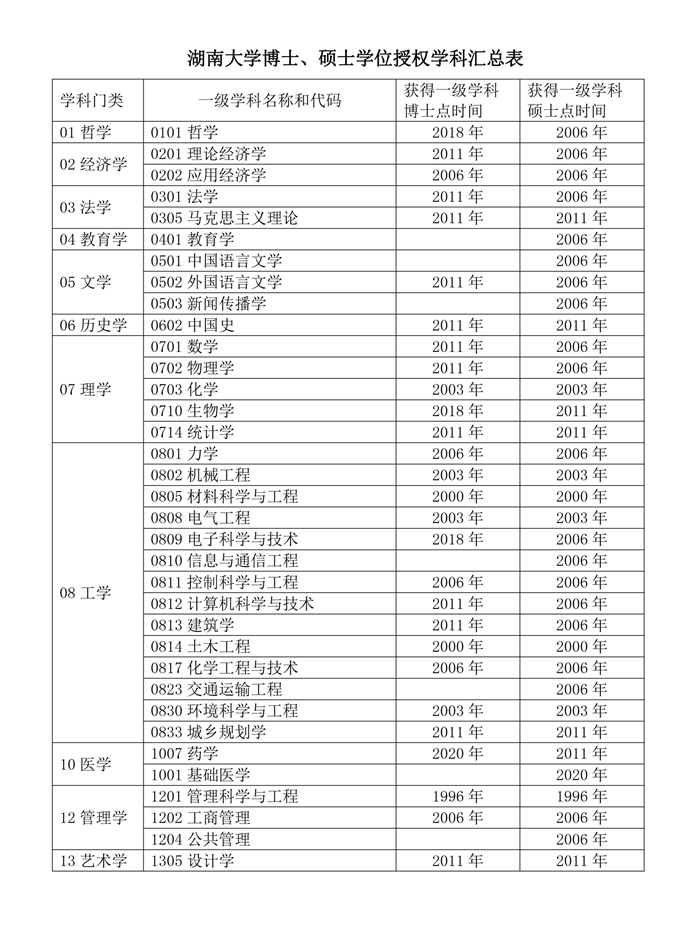 湖南大学博士、硕士学位授权学科汇总表(截至2020)
